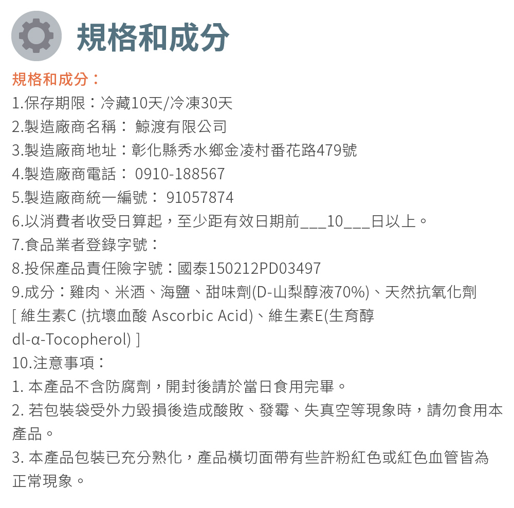 ˙兌換內容: 1.商品名稱:【鯨記商城KDO】 舒肥雞胸肉15片套組線上宅配券(mo) 2.商品規格:舒肥雞胸肉(原味海鹽/黑胡椒/義式香草/蒜味/十全中藥)180g±10g/片,15片/組。 3.商品效期:冷藏10天/冷凍30天 4.使用方法 : 商品解凍至常溫,開封後即可食用,料理入菜後更有風味。 5.製造地: 台灣 ˙兌換說明: 1.票券兌換期間:即日起至_113_年__12__月__29__日止,票券逾期請至原購買通路申請退券。 2.票券使用方式:每張票券可兌換可至指定網站線上登入選擇宅配 3.宅配網址如下:https://www.mohist.com.tw/e-delivery/common/front/ZXB 4.請複製網址登入,並輸入正確的【寄送資訊】和【核銷碼】,以利後續物流配送。 5.本券售出時已開立統一發票,所兌換之商品之金額不再開立發票 6.若有任何問題請與廠商聯絡,連絡電話: 0910-188567 店家資訊 鯨記商城KDO 電話:0910-188567 地址:彰化縣彰化市中正路二段 發行單位 好付數位金融科技股份有限公司 地址:臺北市松山區南京東路5段343號6樓 統一編號:42647852 代表人:黃少風 本商品(服務)禮券銷售所收取之金額,已存入陽信商業銀行之信託專戶,專款專用。 信託期間自禮券銷售日(以票券上記載之銷售日期為準)起算一年。![]()