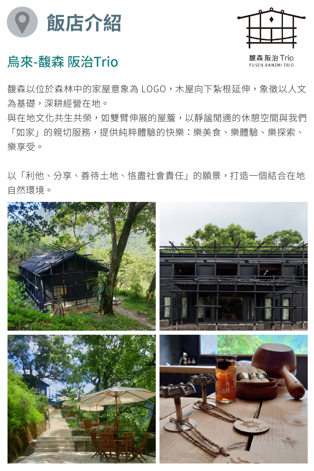 【加價升等】 1.偶浴經典獨立湯屋120分鐘+套餐二份(NT$980+10%/客),平日需加價$1300元/假日需加價$1900元 2.偶浴經典獨立湯屋120分鐘+下午茶二份(NT$500+10%/客),平日需加價$700元/假日需加價$900元 ※餐點內容隨季節時令更,請依現場菜單為準。 ※ 產品價格皆內含雙人餐點,第三人以上需額外點餐,同享不收餐點服務費優惠。 1.溫泉設施開放時間為10:00-22:00,最後進場時間為20:00,每週二為固定休館日無接受預訂。 2.本票券可使用偶浴經典獨立湯屋120分鐘。務必事先完成預約【泡湯】及【用餐】訂位,並告知持券使用。【用餐】需電話預約,【泡湯】需線上訂位:https://inline.app/booking/-MlKF7W82eKQi2THW8XD:inline-live-2/-MlKF7flc4Lo4scEd0kz 3.假日使用須加價$200元,平假日定義:平日(週一至週五);假日(週六、週日或國定假日及由飯店之定義假日) ,農曆春節2/8-2/14不適用。 4.所有房型加時加收NT$600/30min。加人費用NT$1,000/人,並延長房間使用時間30min。 5.孩童使用湯屋:130cm 以下孩童免費,超過 130cm 則與成人收費規則相同。 6.因諾莉餐廳營業時間: 午餐 11:00-14:30 僅供應套餐 ( 最後點餐時間:13:30) 午茶 14:30-17:30 僅供應套餐 ( 最後點餐時間:16:00) 週六、週日午間套餐$1180+10%/位,音樂演出及時段以粉絲團公告為主。 7.優惠期限至2024年03月31日止,逾期未兌換可至原購買通路辦理退費。 門市資訊 馥森阪治Trio 電話:02 2661 6688 地址:233001新北市烏來區環山路151號 發行單位 好付數位金融科技股份有限公司 地址:臺北市松山區南京東路5段343號6樓 統一編號:42647852 代表人:黃少風 本商品(服務)禮券銷售所收取之金額,已存入陽信商業銀行之信託專戶,專款專用。信託期間自禮券銷售日(以票券上記載之銷售日期為準)起算一年。![]()