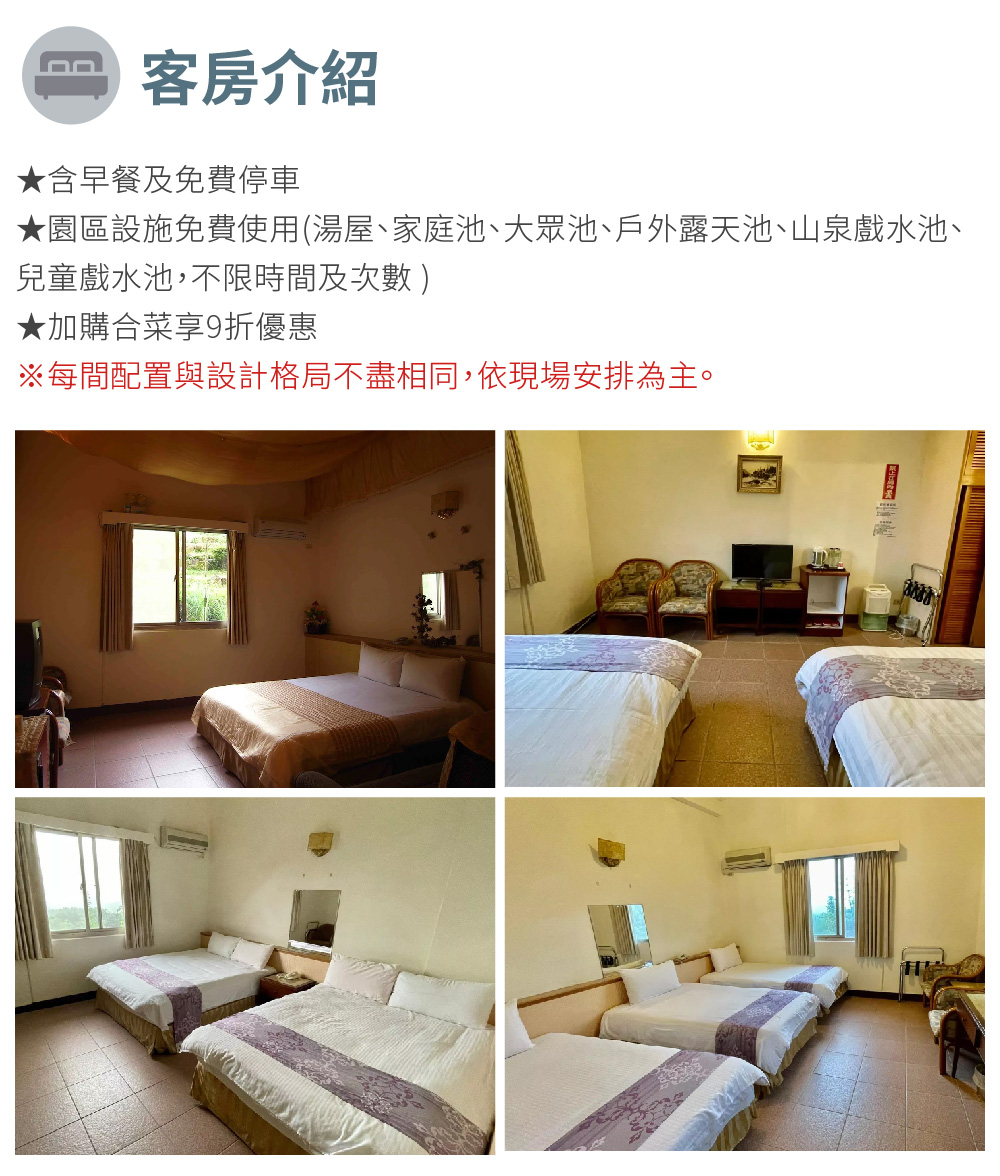 1.本票券週一至週日適用,假日不加價,含雙人早餐,不適用日期依店家公告為準(例:春節不適用2/8~2/13) 2.湯屋、家庭池、大眾池、戶外露天池、山泉戲水池、兒童戲水池,不限時間及次數皆可使用 3.需提前預約,並告知須使用兌換券,預約電話:02-2408-0168 4.泡湯請自備泳衣、泳帽、毛巾、盥洗用品、沐浴用品等 5.check in 時間:15:00 後、check out 時間:12:00 前 6.營業及供餐時間依店家公告為準 7.加購風味合菜可享9折優惠 8.山莊開放中、小型寵物入場,但禁止讓寵物進入泡湯區及游泳池區。凡寵物入場,須出示狂犬病預防注射證明書或證明狗牌,否則不得入場 9.優惠期限至2024年12月31日止,逾期未兌換可至原購買通路辦理退費。 門市資訊 金山綠峰渡假山莊 電話:(02)2408-0168 地址:新北市金山區重和里三重橋22號 營業時間:每週(一)至每週(日);6:00至22:00 發行單位 好付數位金融科技股份有限公司 地址:臺北市松山區南京東路5段343號6樓 統一編號:42647852 代表人:黃少風 本商品(服務)禮券銷售所收取之金額,已存入陽信商業銀行之信託專戶,專款專用。信託期間自禮券銷售日(以票券上記載之銷售日期為準)起算一年。![]()