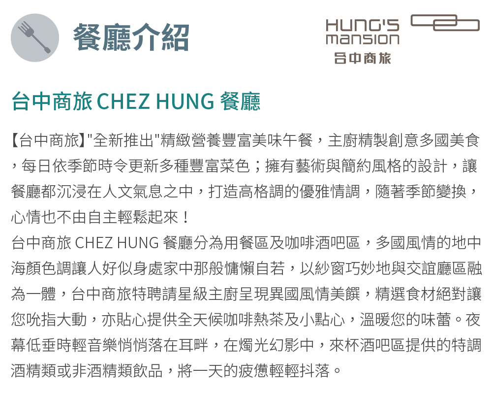 台中商旅【CHEZ HUNG】午間或晚間雙人套餐券 (平假日通用)