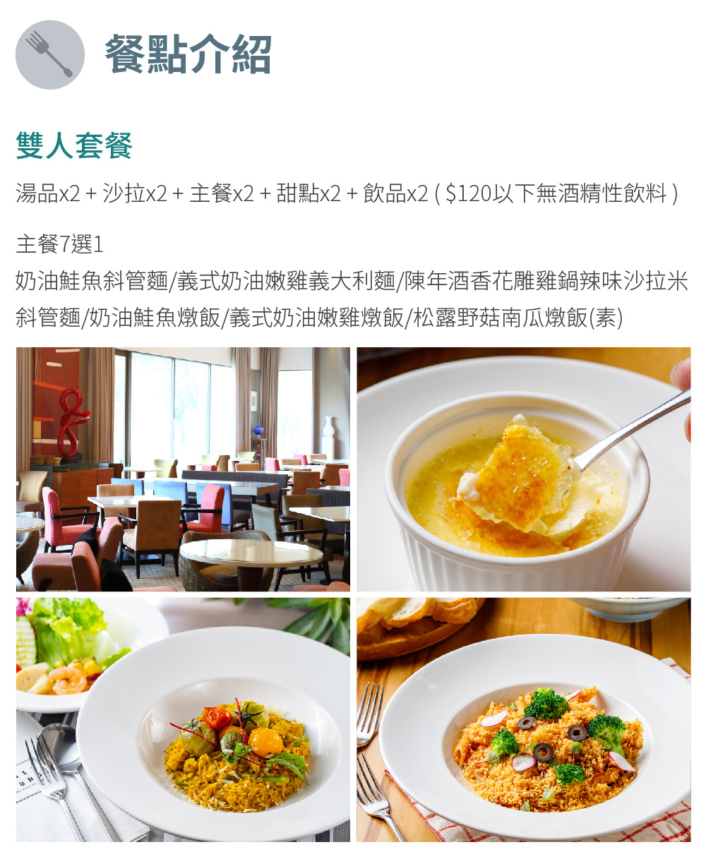 使用說明: 1.雙人套餐內容:湯品*2/沙拉*2/主餐*2/甜點*2/飲品*2($120已下無酒精性飲料)。 2.主餐提供7道供選擇,有:奶油鮭魚斜管麵/義式奶油嫩雞義大利麵/陳年酒香花雕雞鍋/辣味沙拉米斜管麵/奶油鮭魚燉飯/義式奶油嫩雞燉飯/松露野菇南瓜燉飯(素)。 3.本優惠限二人使用,同行第三位起需於現場補最低消費$275 / 人。 4.本券恕無法與其它優惠合併使用。 5.唯母親節、耶誕餐期、農曆春節期間恕不適用。 (實際不適用特殊節日定義依飯店規定為主) 6.實際菜色依現場提供為主。 7.供餐時間:中午11:30~14:00 / 晚上17:30~21:00 8.優惠期限至2021年5月31日止,逾期未兌換可至原購買通路申請退貨。 門市資訊 台中商旅 電話:(04)2255-6688 地址:臺中市西屯區台灣大道三段593號 發行單位 台中商務旅館股份有限公司 地址:臺中市西屯區臺灣大道三段593號 統一編號:28148383 負責人:洪嘉穗 本商品(服務)禮券銷售所收取之金額,已存入陽信商業銀行之信託專戶,專款專用。信託期間自禮券銷售日(以票券上記載之銷售日期為準)起算一年。![]()