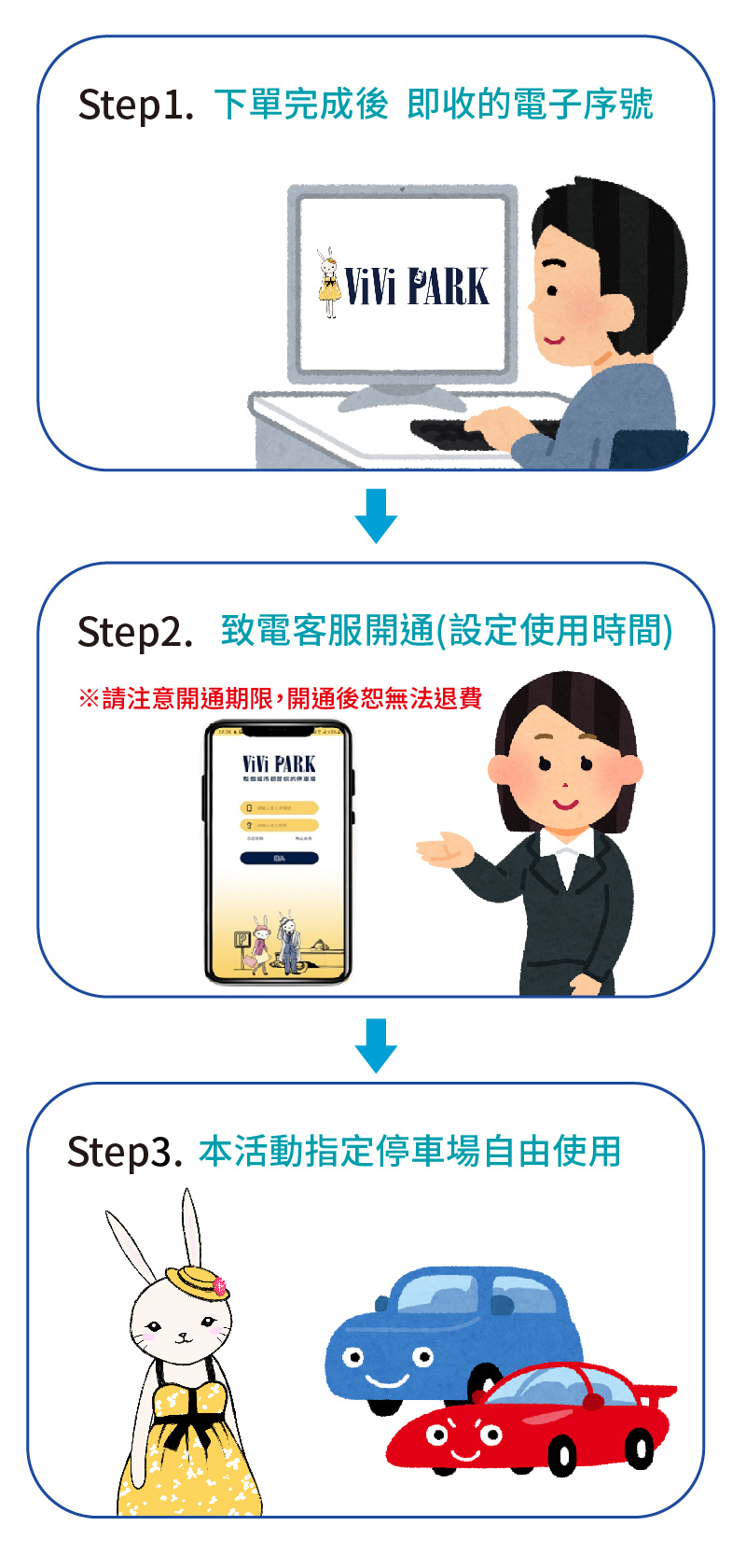 使用方法及注意事項: ●兌換日期:最晚於2024/09/15預約開卡 ●使用期限:雙方約定開始日期可連續使用25日,需連續使用不得間斷 ●時間:24hr ●平、假日及特殊節日皆可使用 ●請於購買後向ViVi PARK車辨通行APP客服預約開通使用權限及系統設定車牌共計5個工作天〈不含例假日及國定假日〉,並告知收件人訊息(含車號)與聯絡方式及開始使用日期,服務開卡專線:(02)25683773#572,來電時間為週一~週五09:00~12:00、13:30~18:00 ●請在預約開通使用權限時,請將汽車行照掃描寄E-Mail:vivipark@kpclc.com.tw。 ●使用ViVi PARK車辨通行APP進出場者,進場請依現場車牌辨識系統辨識進場,離場時,敬請打開ViVi PARK APP,選擇所停的場次或(點選圖資上的P),按結帳後,請盡速離場。 ●經確認使用日期後,不得更改日期、暫停及延長使用期間。 ●此方案經雙方確認開始使用日期後,視同已開通核銷電子序號,怒無法退費。 ●如原方案尚未到期,預約續卡客戶請提早一個禮拜致電客服開通使用權限,恕不接受當日續約,敬請配合。 ●限停登記車號一般小客車1台使用。 ●持ViVi PARK車辨通行APP可停停車場使用(場名及地址請詳閱頁面停車場資訊及使用手冊)。 ●此方案為車辨停車通行APP,持憑證致電核銷並預約開通設定車牌後,依雙方約定日期使用。 ●ViVi PARK停車場採自動化設備車牌辨識進出,請嚴格遵守登記車號一進一出之規定,如違反規定而衍生之問題車牌無法辨識進出場停車,持卡人須自行負責且無法辦理退費(人工計價收費之停車場亦同)。 ●用ViVi PARK車辨通行APP感應進出停車,如有發生車牌無法辨識、非登記使用車牌及車牌汙損,導致無法正常感應停車發生時,恕無法退費,有發生上述禁止之情事,務必請撥02-2568-3773#572協助處理。 ●ViVi PARK車辨通行APP在非使用權限期間,汽車仍然停在場內未出場,請自行在ViVi PARK停車通行APP儲值金額後,依現場計價費率收費掃描出場,若有其他疑問,請撥打專線02-25683773。 ●持ViVi PARK車辨通行APP者請依先到先停為原則,各停車場恕不保留車位。 ●ViVi PARK車辨通行APP在使用期限內,如有導致無法辨識感應停車等情事發生時,恕無法辦理退費。 ●請依照程序開卡並遵守各停車場管理須知,若未遵守將影響使用權益。 ●如發生重大違規使用事實時,有效期限內卡片立即關閉使用權限且無法辦理退費。 ●本券出售時已開立統一發票,消費時將不再開立。 ●不得與其他優惠合併使用,恕無法兌換現金及找零。 ●本公司保留本賣場修改、變更及終止本活動之權利,各項優惠恕不得合併使用。 ●本賣場票券經使用後即時註銷,任意重製、塗改、影印、複製等違法行為,一經查獲必移送法辦。 ●售出之通行APP商品不得任意轉讓或轉售,以避免產生消費糾紛爭議。 ●各項優惠恕不得合併使用,詳細優惠內容及最新訊息,請以商家現場公告為準,商家保留優惠活動解釋、修正、終止本活動之權利 ●優惠期限至2024年09月15日止,逾期未兌換可至原購買通路辦理退費。 門市資訊 1.ViVi PARK宜蘭李科永圖書館停車場 地址:宜蘭縣宜蘭市陽明路256號對面 營業電話:(02)2568-3773 其他資訊詳情請見官網: https://www.vivi-park.com/ 發行單位 好付數位金融科技股份有限公司 地址:臺北市松山區南京東路5段343號6樓 統一編號:42647852 代表人:黃少風 本商品(服務)禮券銷售所收取之金額,已存入陽信商業銀行之信託專戶,專款專用。 信託期間自禮券銷售日(以票券上記載之銷售日期為準)起算一年。![]()