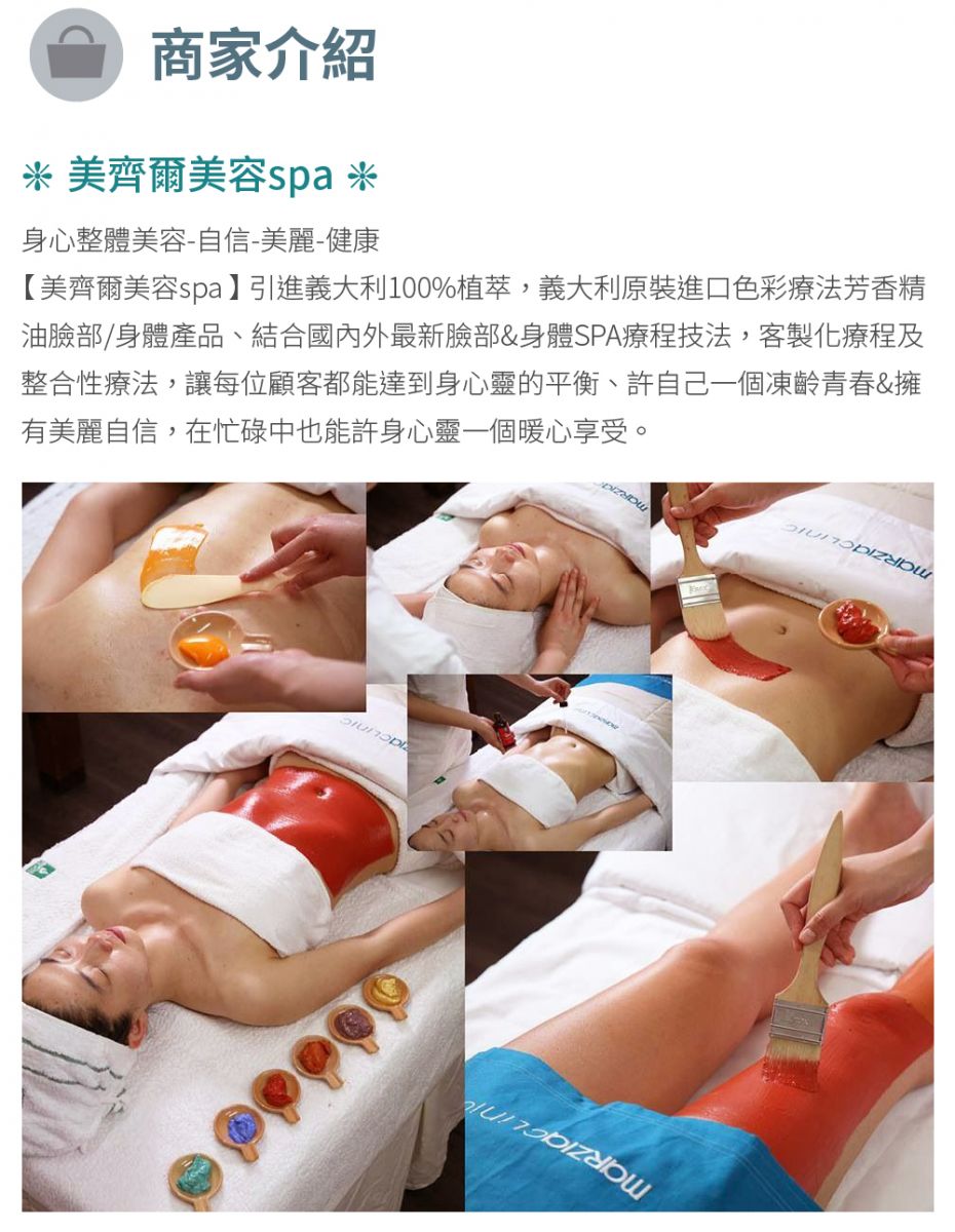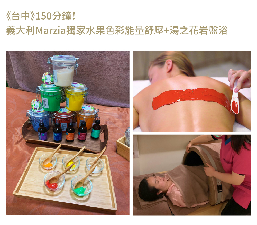 1.義大利Marzia獨家水果色彩能量舒壓+湯之花岩盤浴 共140分 嚴選使用義大利Marzia Clinic精油→個人水果色彩能量分析10分→七大脈輪技法啟動人體脈輪反射區→水果能量霜全身正反面舒壓手技按摩100分→正宗湯之花岩盤浴40分→居家保養 2.可預約時間:週一~週五10:00~18:00,只限平日使用。 3.請至少於一週前先行以電話預約,並告知使用本憑證,實際預約情況視店家當天預約情況為主 。 4.預約保留10分鐘,如無依規定提前預約或逾時,店家有權不接受兌換。 5.限到店使用。 6.每張憑證限一人使用,恕無法與他人併用。 7.每人限體驗一次。 8.僅限女性使用,惟生理期、孕婦不適用,恕不指定美容師。 9.紙本/APP/簡訊憑證皆可使用。 10.本公司保留修改、變更及終止本活動之權利,不得與其他優惠合併使用,恕無法兌換現金及找零。 11.本券優惠期限至2021年06月19日止,逾期未兌換可至原購買通路申請退貨。 門市資訊 美齊爾美容spa 電話:(04)23126835 電話:0965-336830 LINE ID:mg142 地址:台中市西屯區青海路二段142號 發行單位 東森投資股份有限公司 地址:臺北市大安區復興南路1段368號8樓 統一編號:16093757 負責人:廖尚文 本商品(服務)禮券銷售所收取之金額,已存入陽信商業銀行之信託專戶,專款專用。 信託期間自禮券銷售日(以票券上記載之銷售日期為準)起算一年。![]()