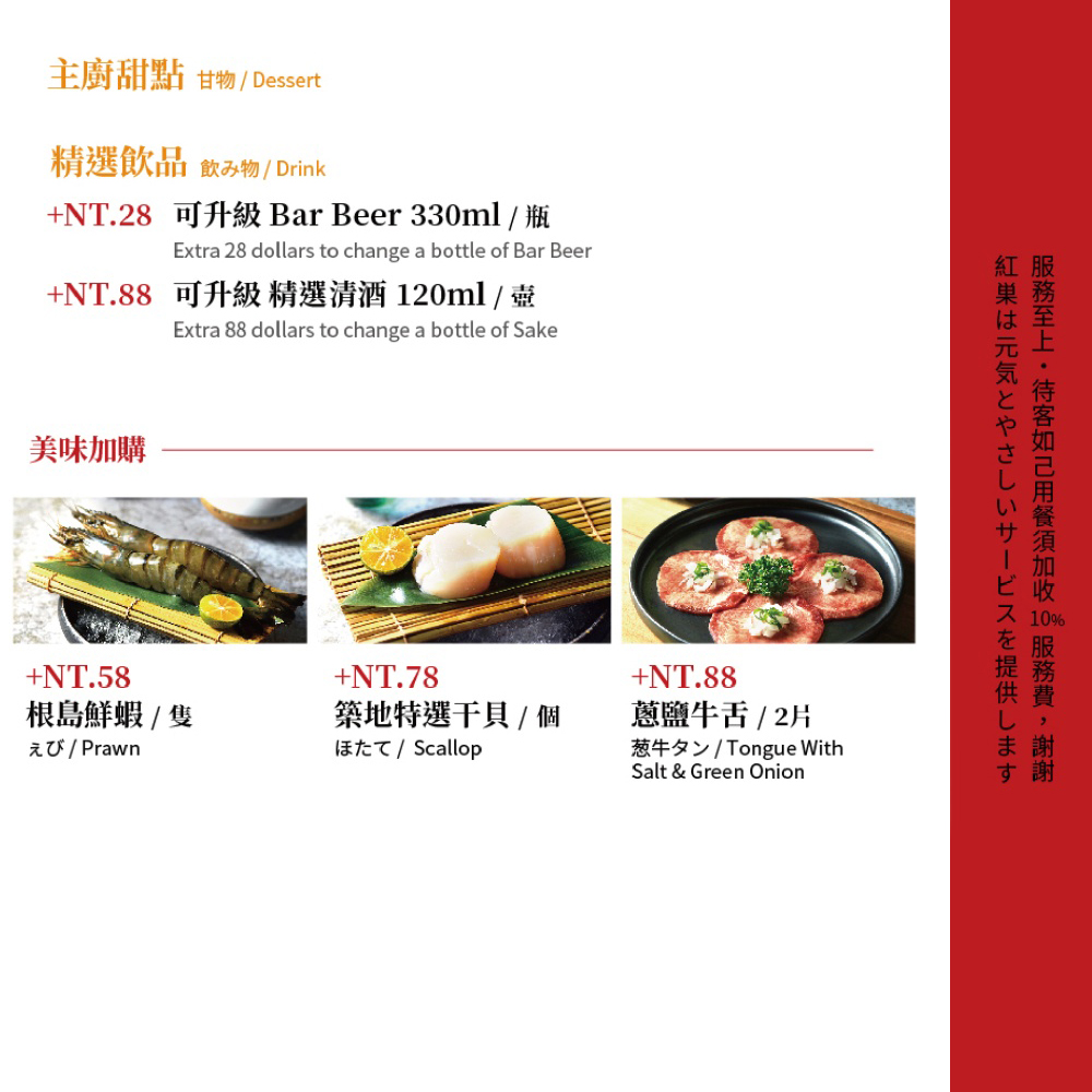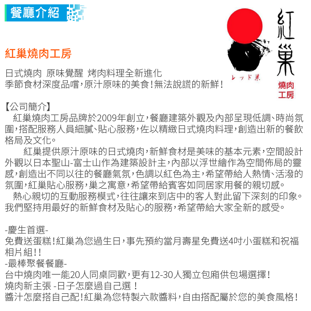1.憑券可兌換好福氣豚海鮮雙人套餐。 2.營業時間:平日週一至週五 11:00~15:00、17:00~22:00;假日與特殊節日11:00-22:00。 3.請提前電話預約並告知使用兌換券,假日每日限量 30 組,假日預約務必電話訂位 04-22559258,勿直接使用網路訂位。避免當日到現場超出組數無法使用兌換券,敬請見諒。 4.2021 年不適用日期:母親節 5/8(六)-5/9(日)、父親節 8/7(六)-8/8(日)、七夕情人節 8/14(六)-8/15(日)、中秋前周末假期與中秋連假 9/12(日)、 9/18(六)-9/21(二) 、聖誕假期 12/24(五)-12/26(日) 5.餐食內容: ※極上強肴│極上松板豬/花東櫻桃鴨胸/椒鹽豚菲力/優格豚五花/活力豚梅花/西班牙伊比利豚梅花/風味雞腿肉 ※海 鮮│根島生態蝦 / 築地特選干貝 ※山 幸│擇一 時令野菜盛合 / 新鮮生菜葉(雙人份) ※出 前│擇一風味沙拉(口味:特調和風醬/日式胡麻醬) ※小 缽│季節膳菜雙人份 ※止 碗│自家製柴魚昆布高湯一壺(可續) ※食 事│花東越光米飯二碗 ※甘 味│擇二 手工黑糖奶酪/紅豆紫米熱甜湯(可加價28元點選精選冰淇淋) ※飲 物│擇二 精選飲品:炭培烏梅汁暢飲/無糖茶花綠茶暢飲/可樂/雪碧 (可加價升等區或補差額點選其他單點飲品) ※升等區: *食事-加價58元可升等為 炙燒起士鮭魚飯一份 *食事-加價78元可升等為 松露野菇拌飯一份 *飲物加價28元可升等為 麒麟BAR BEER一瓶(330ml) *飲物加價88元可升等為 精選清酒120ML/壺 *飲物加價38元可升等為 可爾必思/富士山晴空泡泡飲/粉紅火山莓果泡泡飲/雪山奶泡綠茶/陳年冰梅醋飲 任選一 *甘味加價28元可點選精選冰淇淋一份 ※加購區: *加購58元可享根島鮮蝦一尾 *加購78元可享築地精選干貝一顆 *加購88元可享蔥鹽牛舌二片 *加購188元可享西班牙伊比利豚梅花一份 *加購399元可享日本A5和牛一份 6.本票券不限本人使用,每人不限使用張數,可同時多人使用多張,不得與其他優惠合併使用,恕無法兌換現金及找零。 7.最晚預約或點餐時間:午餐 14:00、晚餐 21:00。 8.圖片僅供參考,餐點內容以現場供餐為準。 9.優惠期限至2021年12月30日止,逾期不得使用,請至原購買通路辦理退費。 門市資訊 紅巢燒肉工房 電話 : (04)2255-9258 地址 : 台中市南屯區公益路二段836號 發行單位 好付數位金融科技股份有限公司 地址:臺北市松山區南京東路5段343號6樓 統一編號:42647852 負責人:黃少風 本商品(服務)禮券銷售所收取之金額,已存入陽信商業銀行之信託專戶,專款專用。![]()