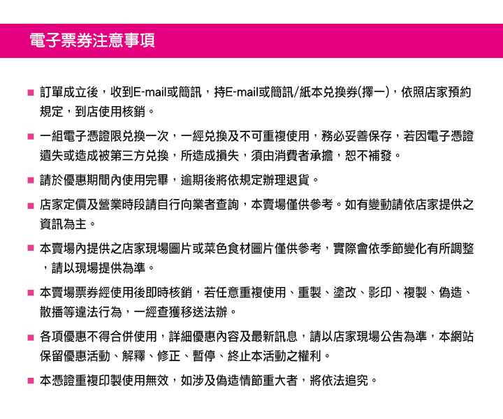 【使用注意事項】 ◎ 不得與其他優惠合併使用,恕無法兌換現金及找零 ◎ 請持手機簡訊或e-mail兌換券到店使用 ◎ 兌換券逾期未使用,可辦理退費。 以上規範如與兌換券不同,則依兌換券為準。