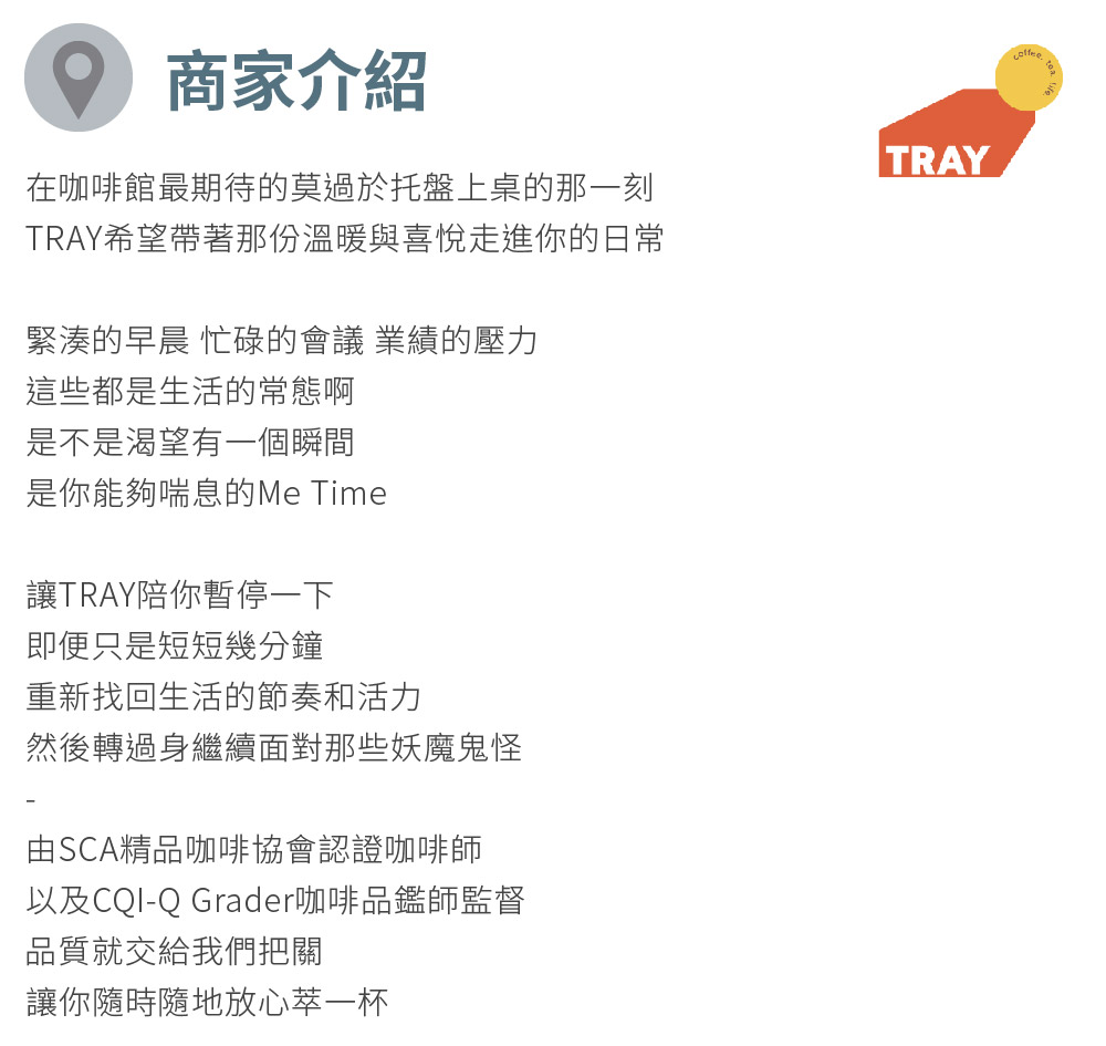 1.憑券兌換票券上所載之指定商品,現場可提供加價兌換同商品不同規格之服務。 2.敬請於三天前來電(02-27500097)告知自取,亦可同步查詢現場貨況。 3.本券僅提供一次性兌換,兌換後即失效。恕不接受手抄、口說序號、截圖方式兌換商品。 4.本券無法兌換現金或找零,且不得與其他行銷活動合併使用。 5.商品圖片僅供參考,實際商品請以店內為準。 6.如部份商品因產品上下架因素無法供應,商家有權更換等值商品替代。 7.本券為不記名,任何人持本券皆可使用,請自行妥善保管,如遭他人盜用,本券不再補發。 8.本券出售時已開立統一發票,所兌換之商品或折抵消費之金額不再開立發票。 9.本券為有價證券,請勿擅自偽造、變造,以免觸犯刑責。 10.本券有效期限至2024年12月31日止,超過日期請至原購買通路退貨。 商家資訊 TRAY 電話: 02-27500097 地址: 台北市中山區遼寧街63巷4號1樓 營業時間: 週一~週五11:00~17:00 發行單位 好付數位金融科技股份有限公司 地址:臺北市松山區南京東路5段343號6樓 統一編號:42647852 代表人:黃少風 本商品(服務)禮券銷售所收取之金額,已存入陽信商業銀行之信託專戶,專款專用。 信託期間自禮券銷售日(以票券上記載之銷售日期為準)起算一年。![]()