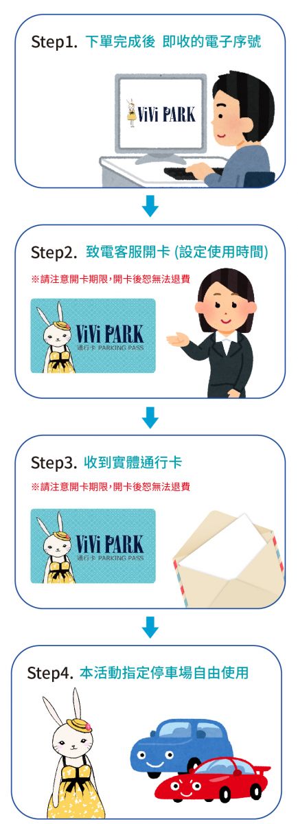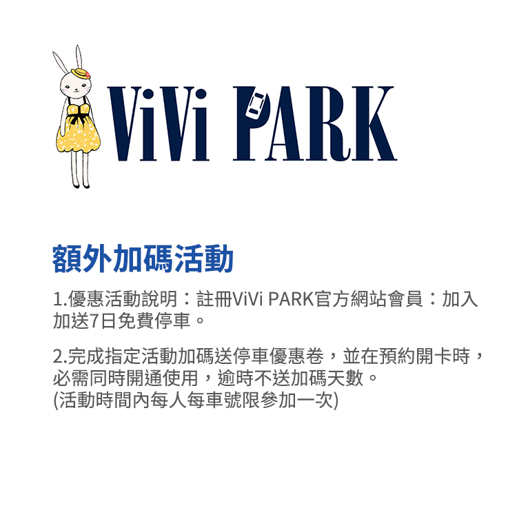 【ViVi PARK 停車場】宜蘭區2場(宜蘭中央、羅東夜市)停車場 平假日無限次數進出連續25日★限停一般小客車停車 1.兌換日期:即日起~2022/02/28(最晚於2021/12/15預約開卡)。 2.使用期限:雙方約定開始日期可連續使用25日,需連續使用不得間斷。 3.優惠活動說明:註冊ViVi PARK官方網站會員:加入加送7日免費停車。 4.時間:24hr。 5.平、假日及特殊節日皆可使用。 6.請於購買後向ViVi PARK通行卡客服預約開卡及通行卡寄送共計10個工作天〈不含例假日及國定假日〉,並告知收件人訊息(含車號)與聯絡方式及開始使用日期,服務開卡專線:(02)25683773#572,來電時間為週一~週五09:00~12:00、13:30~18:00。 7.經確認使用日期後,不得更改日期、暫停及延長使用期間。 8.此方案經雙方確認開始使用日期後,視同已開通核銷電子序號,怒無法退費。 9.完成指定活動加碼送停車優惠卷,並在預約開卡時,必需同時開通使用,逾時不送加碼天數。(活動時間內每人每車號限參加一次)。 10.如原方案尚未到期,預約續卡客戶請提早一個禮拜致電客服開卡,恕不接受當日續卡,敬請配合。 11.限停登記車號一般小客車1台使用。 12.持ViVi PARK通行卡可停停車場使用(場名及地址請詳閱頁面停車場資訊及使用手冊)。 13.此方案為實體停車通行卡,持憑證致電核銷並預約開卡,收到通行卡後方依雙方約定日期使用。 14.ViVi PARK停車場採自動化設備刷卡進出,請嚴格遵守登記車號一進一出之規定,如違反規定而衍生之問題無法刷卡進出場停車,持卡人須自行負責且無法辦理退費(人工計價收費之停車場亦同)。 15.用ViVi PARK藍色方形通行卡感應刷卡進出停車,如有發生異常無法使用,禁止現場抽圓形黃色票卡(下稱票卡)臨停方式進場停車,有發生上述禁止之情事,務必將票卡繳清費用後歸還或致電02-2568-3773#572協助處理,票卡如有遺失發生之情事,請繳遺失費用新台幣200元整。 16.ViVi PARK通行卡在非使用權限期間,汽車仍然停在場內未出場,依現場計價費率收費,出場前請撥打專線02-2568-3773詢問應繳停車費用並繳完費用後出場。 17.持ViVi PARK通行卡者請依先到先停為原則,各停車場恕不保留車位。 18.ViVi PARK通行卡在使用期限內,如有遺失、破損或導致無法辨識感應停車等情事發生時,恕不補發且無法辦理退費。 19.請依照程序開卡並遵守各停車場管理須知,若未遵守將影響使用權益。 20.如發生重大違規使用事實時,有效期限內卡片立即鎖卡且無法辦理退費。 21.本券出售時已開立統一發票,消費時將不再開立。 22.不得與其他優惠合併使用,恕無法兌換現金及找零。 23.本公司保留本賣場修改、變更及終止本活動之權利,各項優惠恕不得合併使用。 24.本賣場票券經使用後即時註銷,任意重製、塗改、影印、複製等違法行為,一經查獲必移送法辦。 25.售出之通行卡商品不得任意轉讓或轉售,以避免產生消費糾紛爭議。 26.優惠期限至2022年02月28日止,逾期未兌換請至原購買通路辦理退費。 門市資訊 ViVi PARK宜蘭中央停車場 電話:(02)2568-3773 地址:宜蘭縣宜蘭市新民路108號對面空地 ViVi PARK羅東夜市停車場 電話:(02)2568-3773 地址:宜蘭縣羅東鎮和平路78號 發行單位 好付數位金融科技股份有限公司 地址:臺北市松山區南京東路5段343號6樓 統一編號:42647852 負責人:黃少風 本商品(服務)禮券銷售所收取之金額,已存入陽信商業銀行之信託專戶,專款專用。信託期間自禮券銷售日(以票券上記載之銷售日期為準)起算一年。![]()