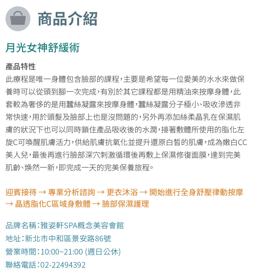 中和【雅姿軒SPA概念美容會館】月光女神舒緩術