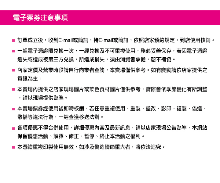 【使用注意事項】 ◎ 不得與其他優惠合併使用,恕無法兌換現金及找零 ◎ 請持手機簡訊或e-mail兌換券到店使用 ◎ 兌換券逾期未使用,可辦理退費。 以上規範如與兌換券不同,則依兌換券為準。