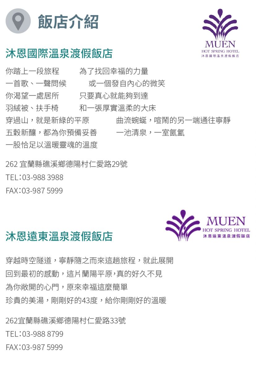 1.本券週一至週日適用(週五至週日需現場加價) 2.本券可至【沐恩國際溫泉渡假飯店】或【沐恩遠東溫泉渡假飯店】擇一使用 3.雙人泡湯休息〈含雙人房(不限房型)泡湯休息90分鐘 + 停車位〉 4.不適用日:2021/12/31、2022/1/1~2、2022/1/29~2/6、2/26~28 5.假日加價:週五至週日需加價200元使用 6.本優惠限 2 人使用 7.不需預約,使用前30分鐘需致電詢問是否有無房間,敬請配合,電話:(03)988-8799 8.優惠期限至2022年03月31日止,逾期未兌換請至原購買通路辦理退費。 店家資訊 礁溪沐恩國際溫泉渡假飯店 電話:(03)988-3988 地址:宜蘭縣礁溪鄉仁愛路29號 營業時間:週一至週日 24hrs 沐恩遠東溫泉渡假飯店 電話:03-988 8799 地址:宜蘭縣礁溪鄉德陽村仁愛路33號 營業時間:週一至週日 24hrs 發行單位 好付數位金融科技股份有限公司 地址:臺北市松山區南京東路5段343號6樓 統一編號:42647852 代表人:黃少風 本商品(服務)禮券銷售所收取之金額,已存入陽信商業銀行之信託專戶,專款專用。 信託期間自禮券銷售日(以票券上記載之銷售日期為準)起算一年。![]()