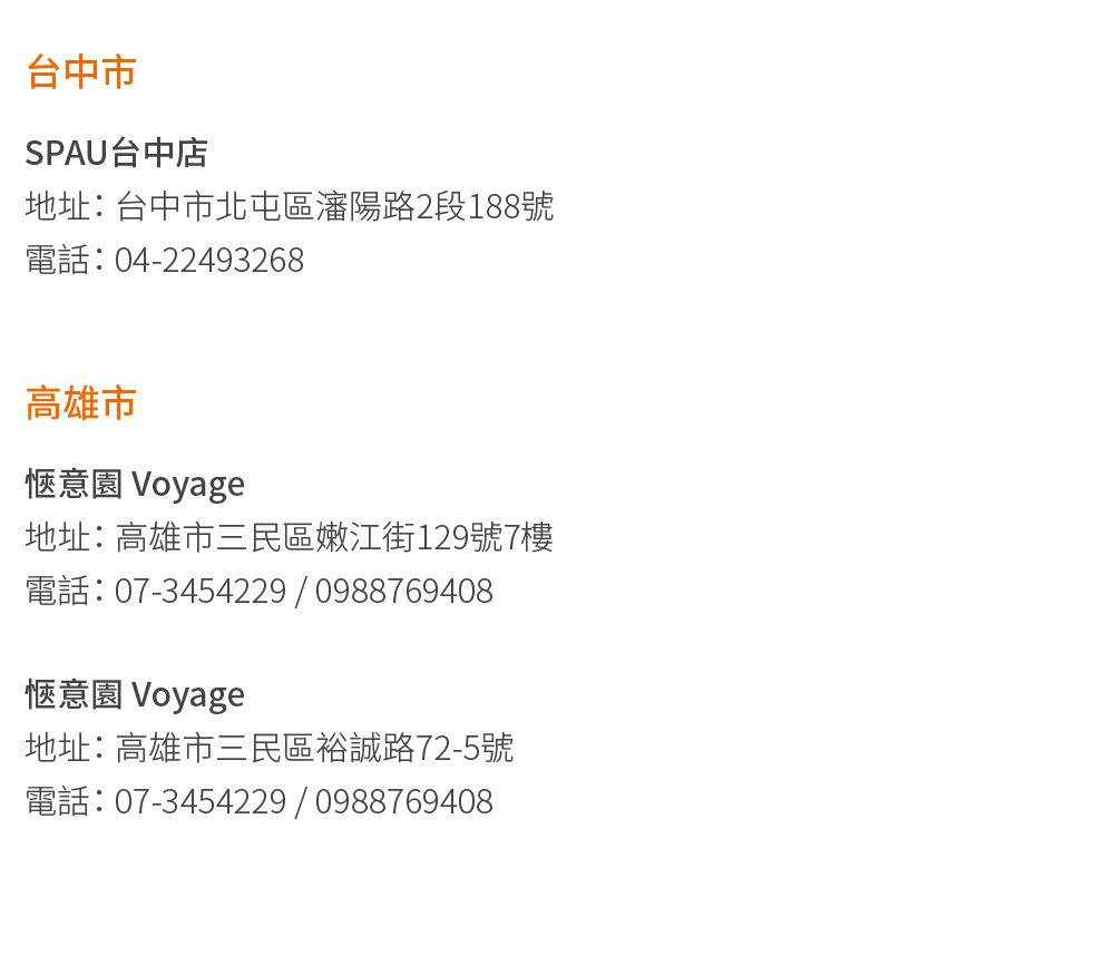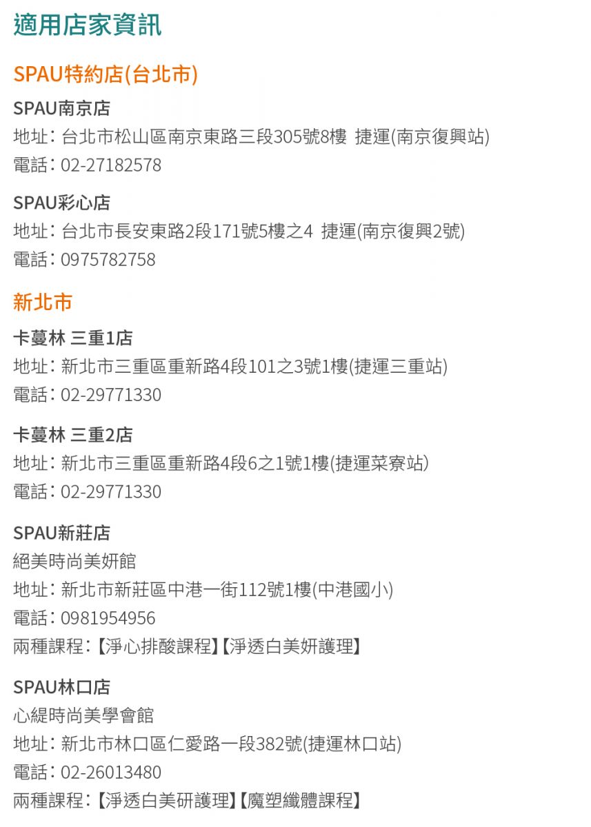 1.本券可單人(限女性)於SPAU美學聯盟適用分店使用。 2.通用券內容包含: (1)單張使用【魔塑纖體課程45分鐘】(局部手臂/背部/大腿/小腿): 諮詢→沐浴→深層潔淨-05分→微循環-10分→纖體魔塑-10分→O2排水引導(微導遠紅外線電熱毯)-20分→潔淨/茶點 3.本券平假日皆適用,不得指定美容師、療程房型,使用本券請提前預約。 4.因會館課程美容師服務時間皆採預約制,請務必提前三天預訂並告知使用本券及內容,若未依規定提前以電話預約,會館有權不接受兌換本券之商品服務。 5.預約遲到15分鐘視同取消該次預約,敬請配合,恕不接受現場直接預約。 6.本券恕無法與其他優惠及專案合併使用。 7.優惠期限至2022年12月31日止,逾期未兌換可至原購買通路辦理退費。 門市資訊 SPAU南京店 電話:02-27182578 地址:台北市松山區南京東路三段305號8樓 捷運(南京復興站) SPAU彩心店 電話:0975782758 地址:台北市長安東路2段171號5樓之4 捷運「南京復興」2號 卡蔓林 三重1店 電話:02-29771330 地址:新北市三重區重新路4段101之3號1樓(捷運三重站) 卡蔓林 三重2店 電話:02-29771330 地址:新北市三重區重新路4段6之1號1樓(捷運菜寮站) SPAU林口店 心緹時尚美學會館 電話:02-26013480 地址:新北市林口區仁愛路一段382號(捷運林口站) P.S 僅提供【淨透白美妍護理】【魔塑纖體課程】 SPAU台中店 電話:04-22493268 地址:台中市北屯區瀋陽路2段188號 愜意園 Voyage 電話:07-3454229/0988769408 地址:高雄市三民區嫩江街129號7樓 愜意園 Voyage 電話:07-3454229/0988769408 地址:三民區裕誠路72-5號 發行單位 好付數位金融科技股份有限公司 地址:臺北市松山區南京東路5段343號6樓 統一編號:42647852 代表人:黃少風 本商品(服務)禮券銷售所收取之金額,已存入陽信商業銀行之信託專戶,專款專用。信託期間自禮券銷售日(以票券上記載之銷售日期為準)起算一年。![]()