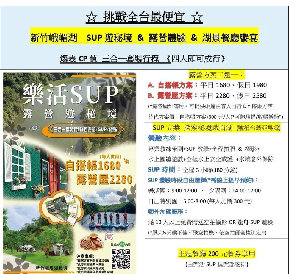新竹峨眉湖【樂活SUP立槳】 4人SUP遊秘境露營屋券_超高CP值(露營屋+SUP+餐點)(MO)