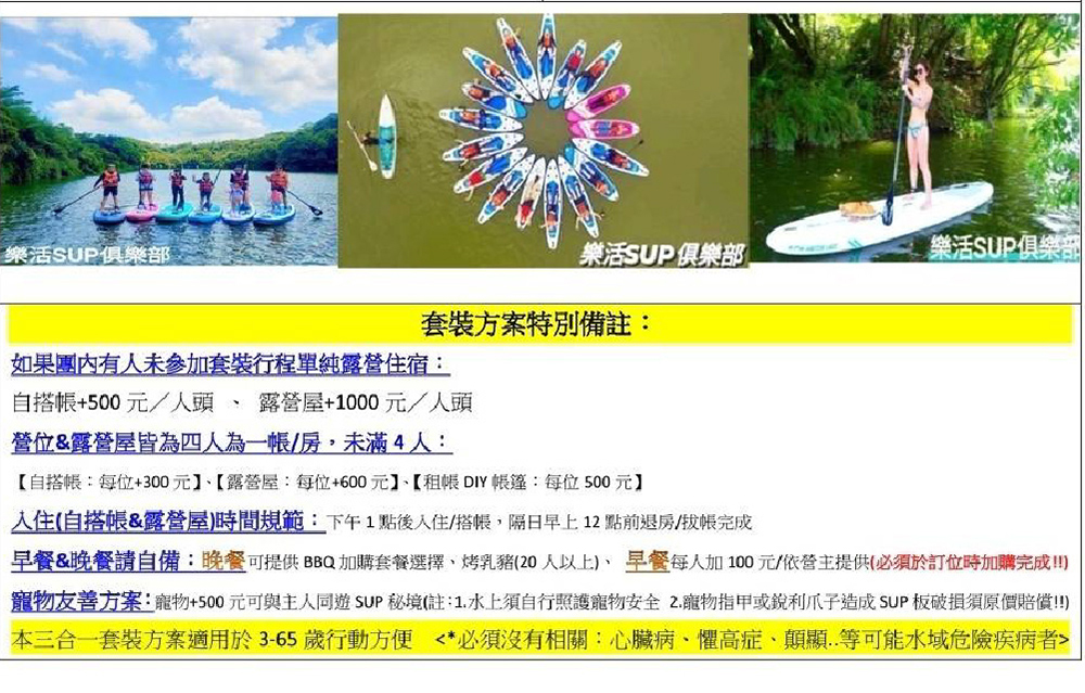 ☆ 挑戰全台最便宜 ☆ 爆表CP值三合一露營券: ♡享受露營放鬆樂趣:露營屋。 ♡Sup秘境帶團(3H)_探索秘境峨眉湖(號稱台灣亞馬遜) 專業教練帶團+SUP教學_全程拍照&攝影+水上團體遊戲+全程教練安全陪同指導+水域意外保險 時間:全程3小時。 ♡百萬湖景餐廳饗宴:提供主題餐廳200元餐券(由樂活SUP俱樂部安排) ♡一人只需2,280元 ♡滿10人以上免費贈送送價值$3,900的空拍或龍舟SUP體驗(風大和天候不佳不飛空拍機,以空拍師全權決定);超過15位,再加贈價值$3,000,3分鐘後製精緻短片。 ˙兌換說明: 1.票券兌換期間:即日起至112年10月31日止。 2.票券使用方式:每張票券可兌換4人SUP遊秘境露營屋+SUP3小時體驗+餐點。 3.本券平日使用(周一至周四使用)。 4.本券假日(周五六日)、三天以上連續假日(不含休假日最後一日)等假日使用每張券每次需現場加價 1200 元 (※平假日及跨年、連續假期、重大活動期間定義,依計樂部現場規定。) 5. 本券使用須3日前完成預約,預約時須提供票夾畫面或核銷碼,並請留下聯絡人姓名、聯絡人電話,預約專線:0980088451。 6.本券使用時間:樂活團(09:00-12:00),夕陽團(14:00-17:00)。 7 本券使用時間:日出特別團05:00-08:00,每券加價$300。 8.本券恕無法與其他優惠及專案合併使用。 9.本券優惠期限逾期需依現場規定補價差使用。 10.確認訂房後,取消或延期入住日期,依「觀光旅館業與旅館業及民宿個別旅客直接訂房定型化契約應記載及不得記載事項」規定返還保證金。 11. 本賣場票券銷售時已開立代收轉付收據或統一發票,使用時俱樂部或餐廳現場不再另行開立。 門市資訊: 新竹峨眉湖(號稱台灣亞馬遜) 電話:0980088451 地址:新竹縣峨眉鄉石井村1鄰復興頭1之1號 預約時間:週一至週日 10:00~18:00 發行單位 好付數位金融科技股份有限公司 地址:臺北市松山區南京東路5段343號6樓 統一編號:42647852 代表人:黃少風 本商品(服務)禮券銷售所收取之金額,已存入陽信商業銀行之信託專戶,專款專用。信託期間自禮券銷售日(以票券上記載之銷售日期為準)起算一年。![]()