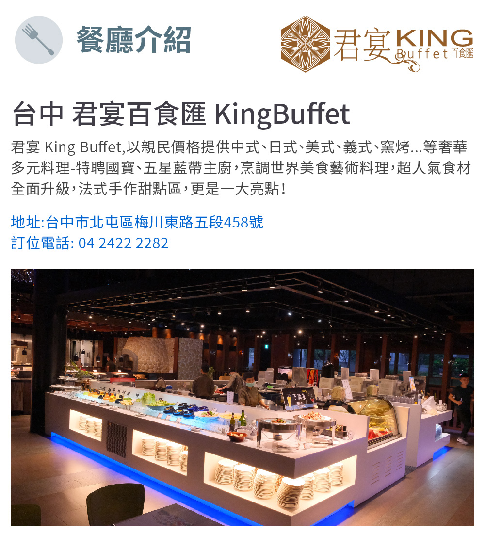 台中【君宴百食匯 KingBuffet】平日晚餐或假日午/晚餐吃到飽一客MO
