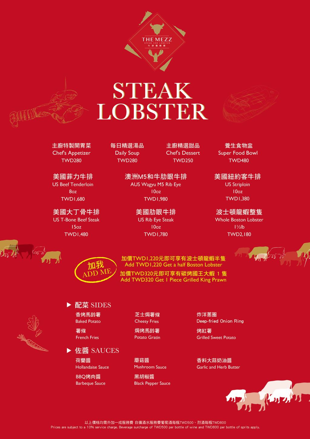 《THE MEZZ牛排龍蝦館》單人經典火烤整隻龍蝦或牛排套餐