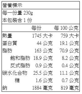 內容物:鮑螺、花菇、火腿肉、馬友鹹魚、紅蔥頭、蒜、朝天椒、蝦皮、冬菜、蝦醬、鹽、冰糖、香油、辣椒油、大豆沙拉油、花生粉