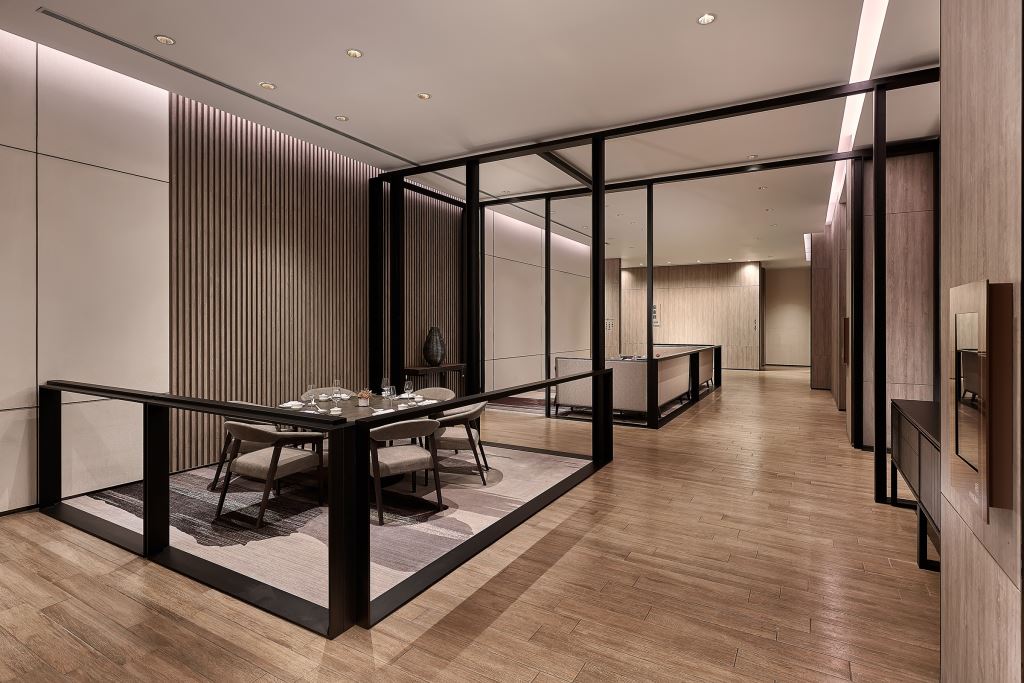 在沉穩簡潔的舒適用餐環境,採光絕佳的大片落地窗,中央鏤空廊道彷若通往古代蜀道之路,穿透交織,汲取淵遠流長之養分,味展新意。