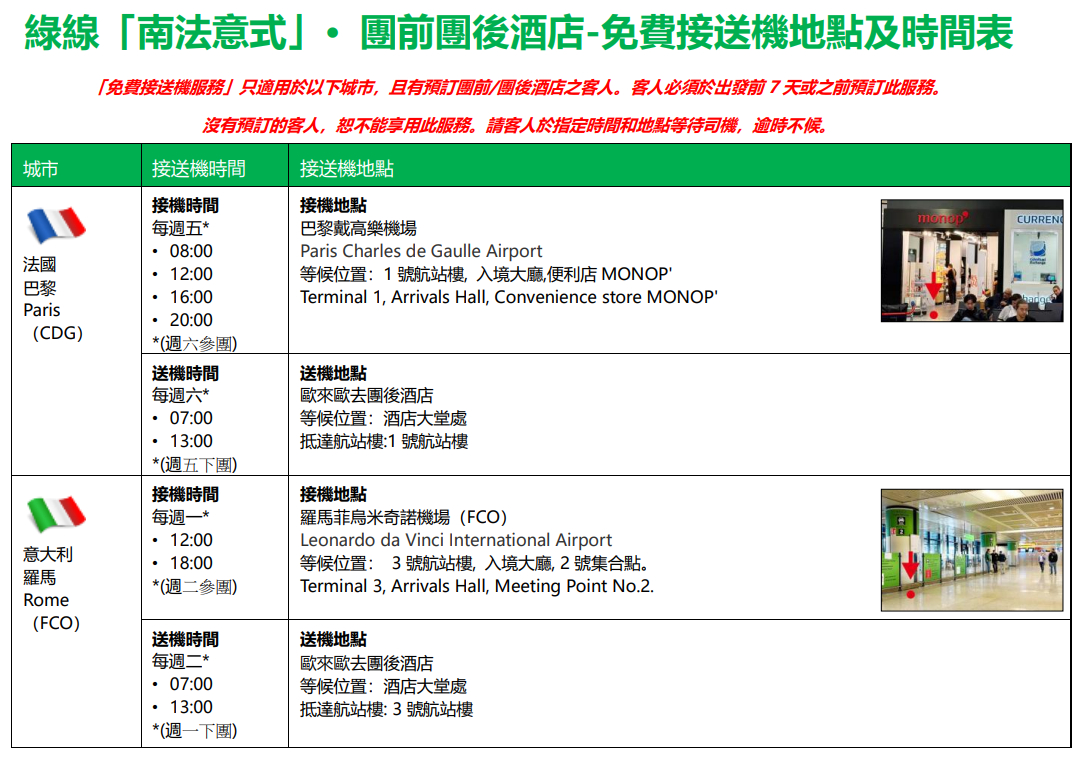 (4) 「免費接機服務」只會於指定時間停留在指定機場集合點,逾時不候。如客人在預訂時間沒有出現,司機不會主動通知客人或等候客人上車。詳細「機場接機時間表」,請參閱下方的「團前團後酒店-免費接送機時間表」。