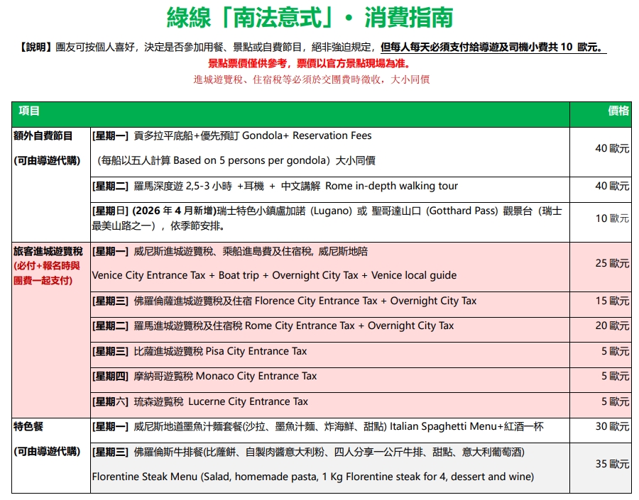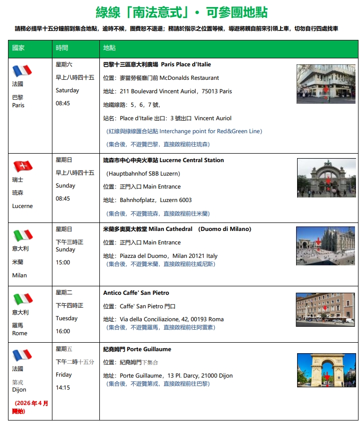 綠線南法意式7日遊─【成人票】12歲以上 或 【配房票】