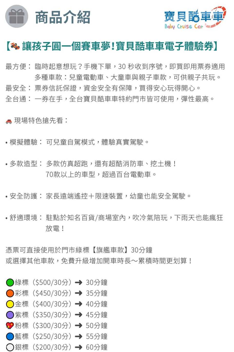 1.此票券可使用於寶貝酷車車全台門市&市集。