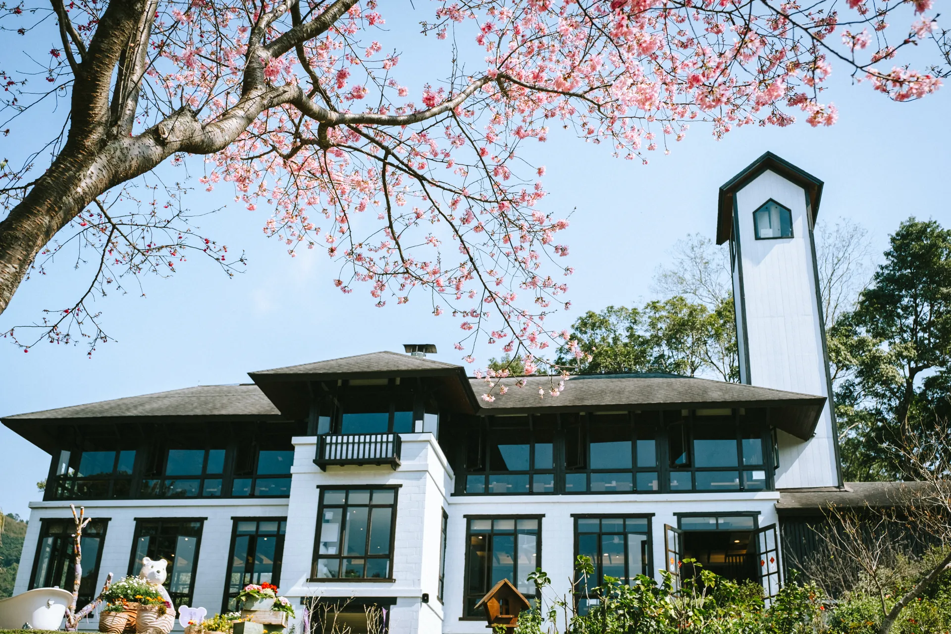 ◎ 森林咖啡館:白色阿爾卑斯山式木造建築,依山傍溪而建,可以遠眺窗外應接不暇的美麗風景,當夜幕低垂,夢想鐘響起時,虔誠的許下心願,讓願望隨著鐘聲傳送到山川林間,所有的夢想都將成真…冬天三樓中庭的火爐將溫暖隨著明暗搖曳的火光,送給室內每一個朋友。