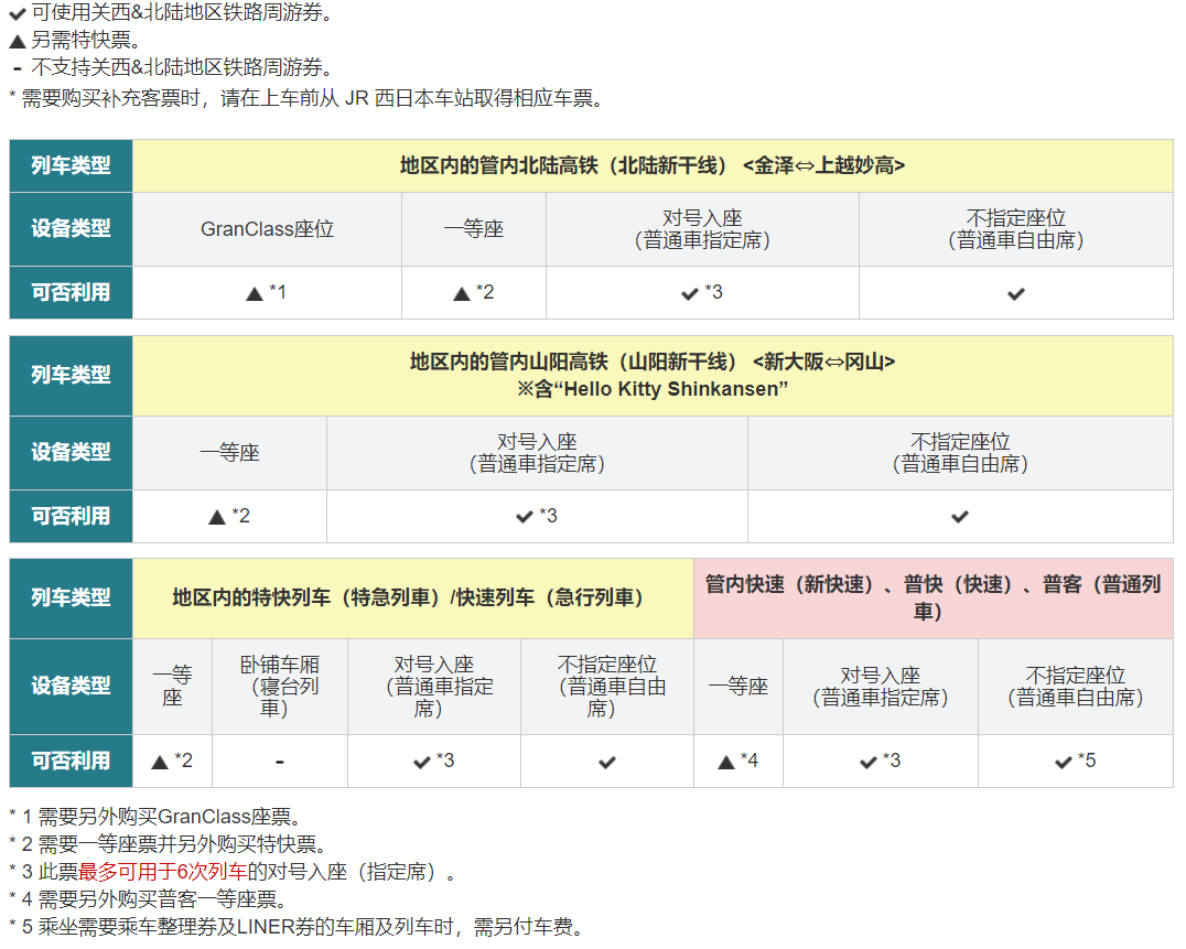 - 特快列車"HARUKA、THUNDERBIRD、KUROSHIO、KOUNOTORI、SUPER HAKUTO(京都⇔上郡)"等上的對號入座(可使用指定席券)