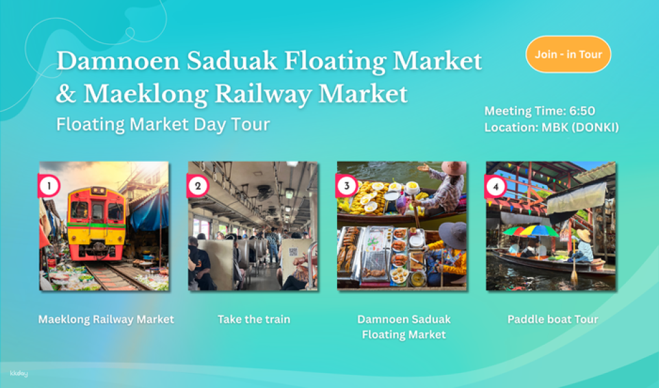 從 MBK 購物中心出發,第一站先參觀獨特的美功市場,觀賞火車穿梭在繁忙的各種攤位之間。隨後可以在美功站內購物,再搭火車前往 Lat Yai 站。在這,您可以探索繁忙的丹能莎朵水上市場,搭乘 30 分鐘的運河遊船。
