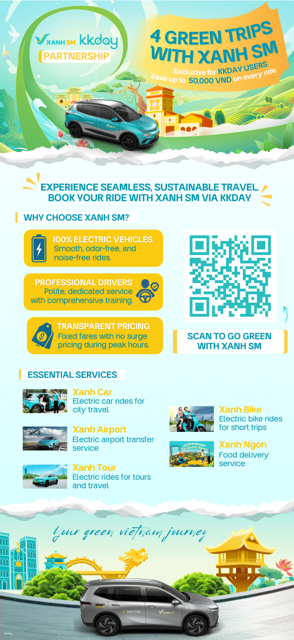 暢玩會安珍珠島主題公園,並隨票免費獲得價值 50,000 越南盾的 Xanh SM 交通優惠券。搭乘 Xanh SM 電動車,享受舒適且環保的移動方式,讓您的行程更加順暢、便利且無憂。