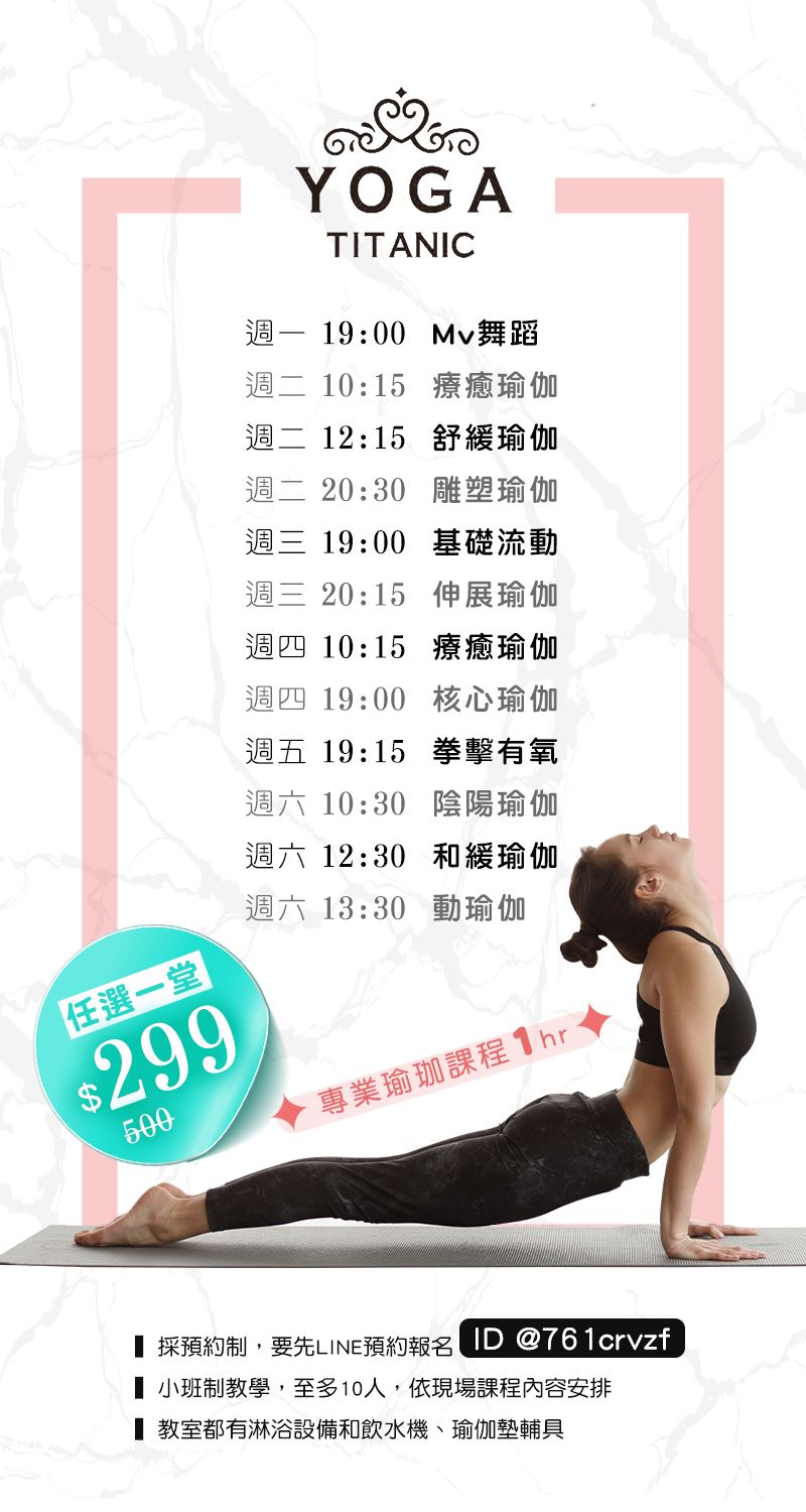 Titanic Yoga-Yoga置身於東區,下班後最火紅的活動,教室為純白大理石紋裝潢,明亮寬敞,一進教室就是讓人心情放鬆!
