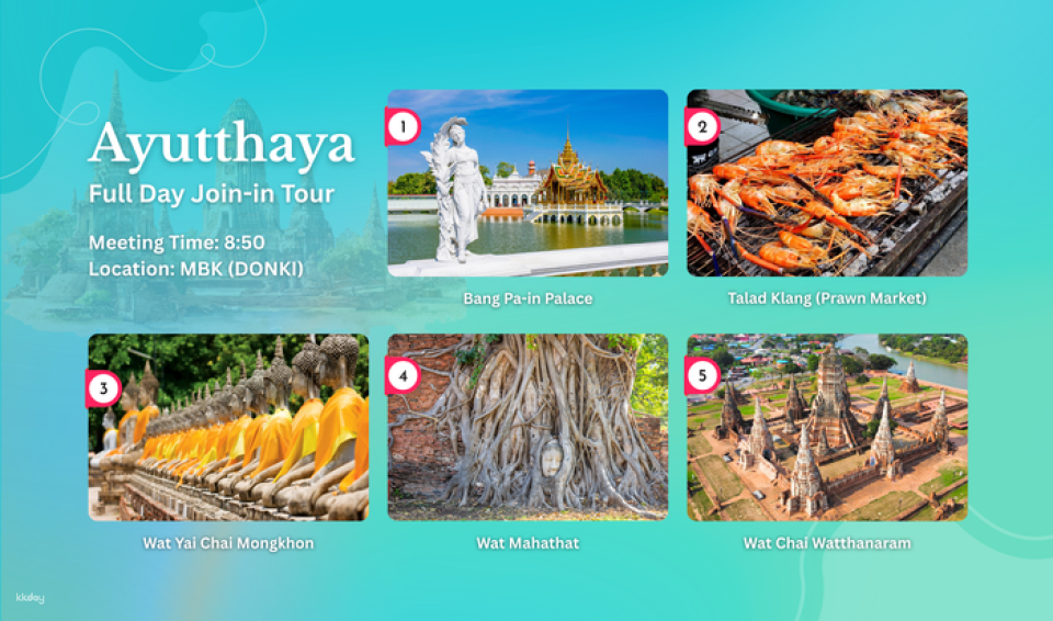 一日遊包括參觀邦芭茵夏宮、中央市場 Talad Kung 午餐(自費)以及探索標誌性寺廟,如尼維塔瑪帕萬寺 Wat Niwet Thammaprawat、崖差蒙空寺 Wat Yai Chai Mongkhon、瑪哈泰寺 Wat Mahathat 和柴瓦塔那蘭寺 Wat Chaiwatthanaram。