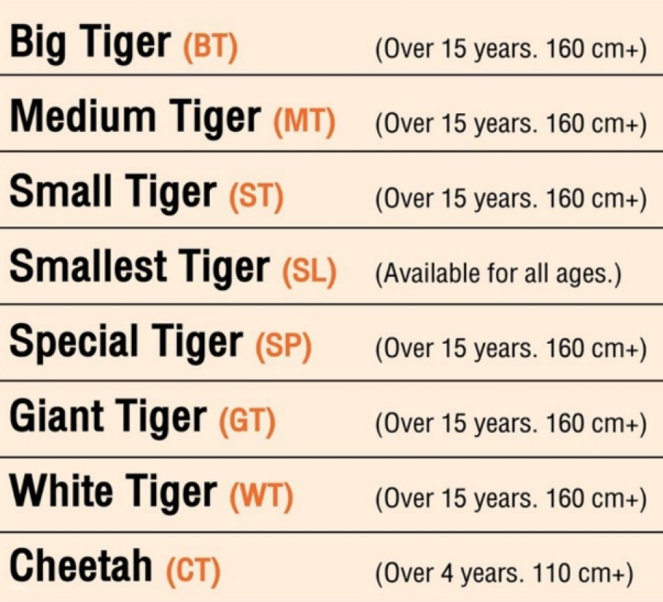 - 虎王國重要政策:顧客必須使用本公司提供的交通工具。否則,抵達時將被收取全額費用。