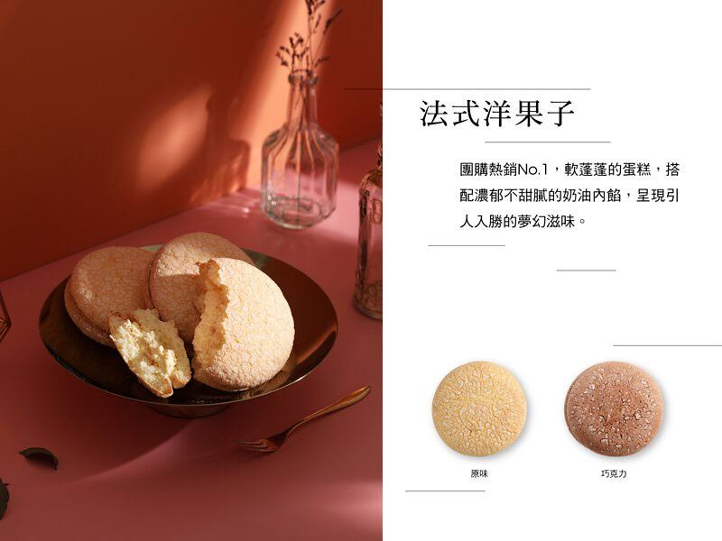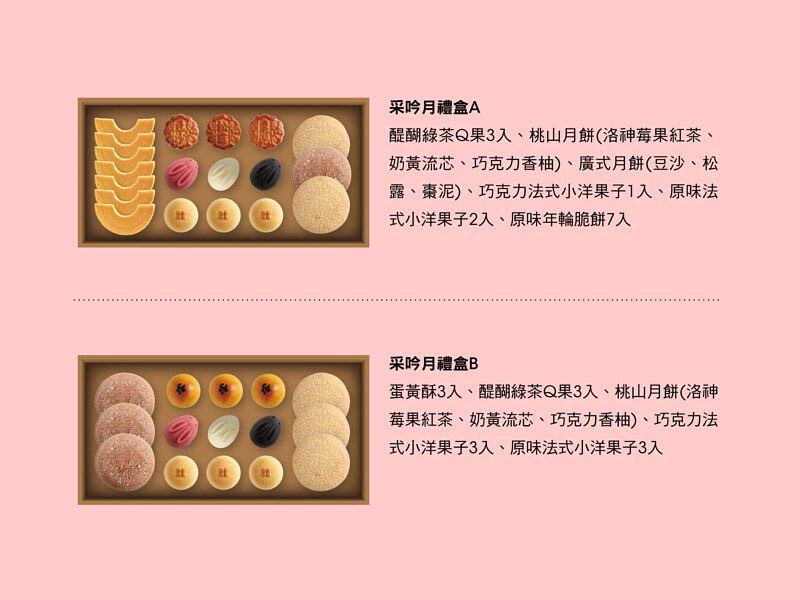 內容物:蛋黃酥3入+醍醐綠茶Q果3入+桃山月餅(洛神莓果紅茶、奶黃流芯、巧克力香柚 )+巧克力法式小洋果子3入+ 原味法式小洋果子3入