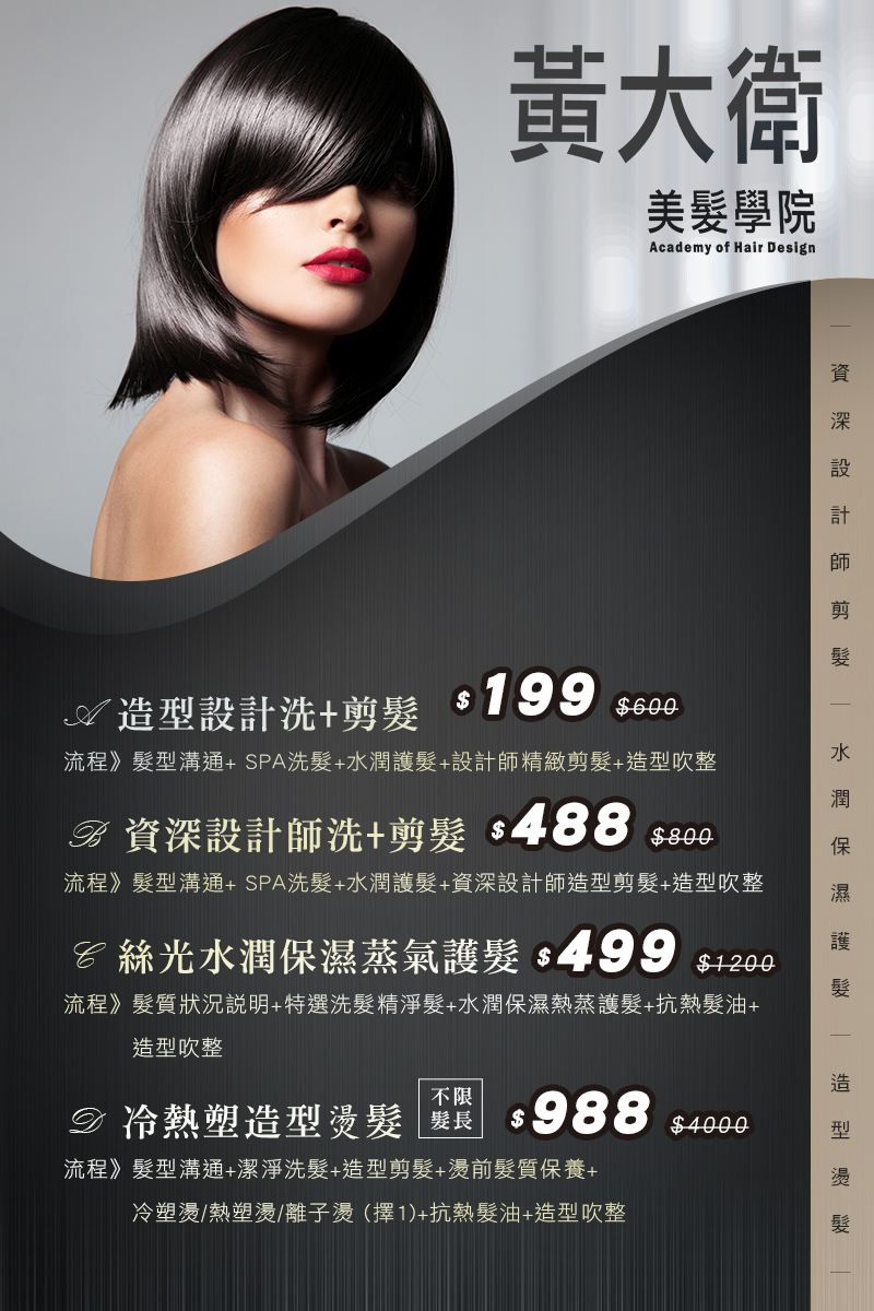 美髮大變身!無論是浪漫的捲度、氣質的直髮,與專業設計師溝通,經由他們的巧手,搭配冷塑燙/熱塑燙/離子燙擇一,亮麗的造型讓您大變女神男神。
